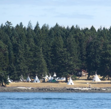 We sped across Spieden Channel from Roche Harbor in our inflatable, eager to hike the trail to Turn Point Lighthouse on Stuart Island. Warm sunshine and calm wind beckoned us across the smooth water. Above the roar of the Suzuki outboard, we heard a bell ring at noon from Camp Nor-wester. Throttling back the engine, I steadied the camera to snap a photo of the village of tipis on the western end of Johns Island.